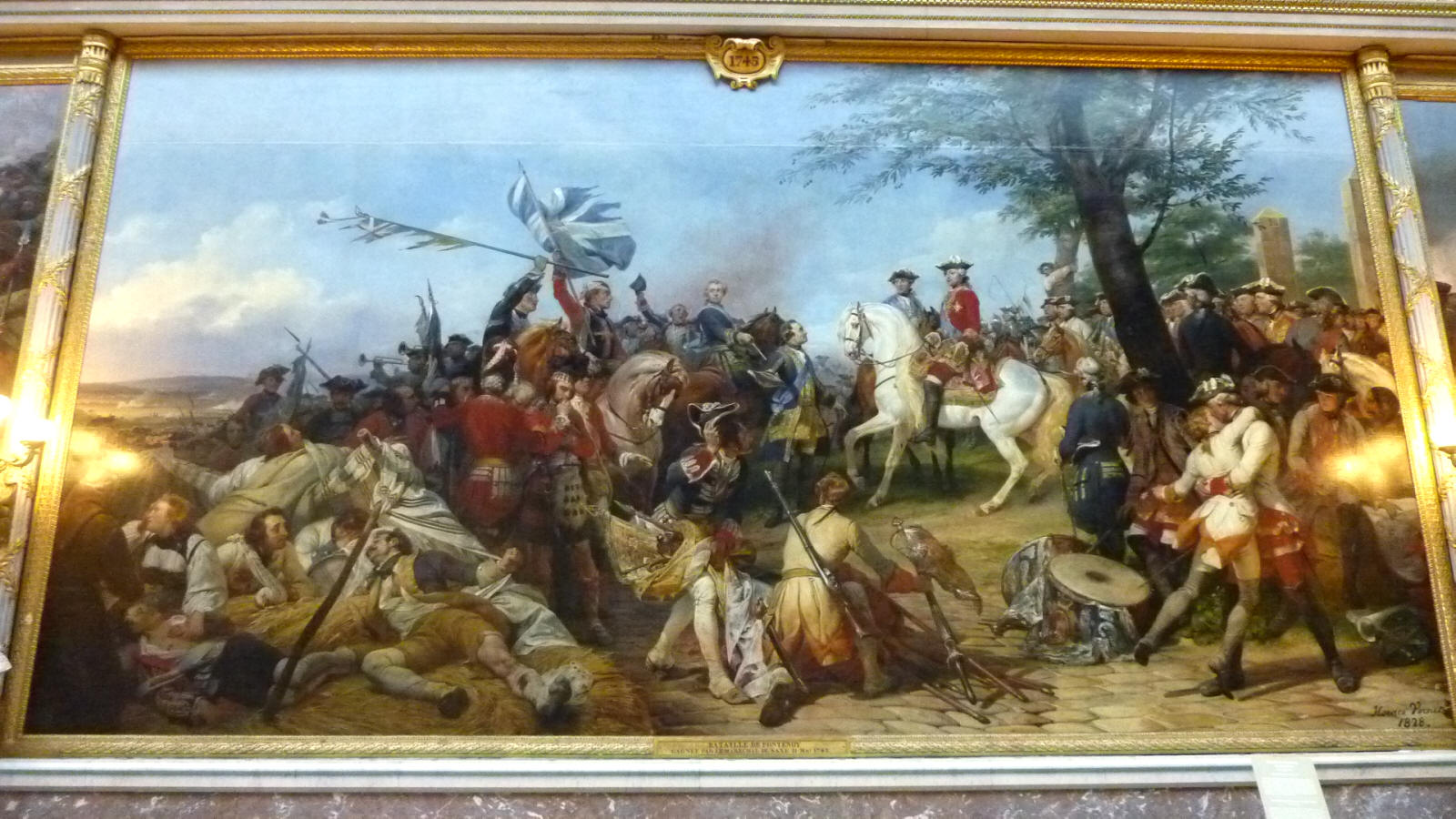 la bataille de Fontenoy gagnée par le Maréchal de Saxe 11 mai 1745 (le Maréchal de Saxe présente les prisonniers et les drapeaux pris aux Anglais et aux Hollandais à Louis XV et au Dauphin - tableau d'Horace Vernet - 1828)
