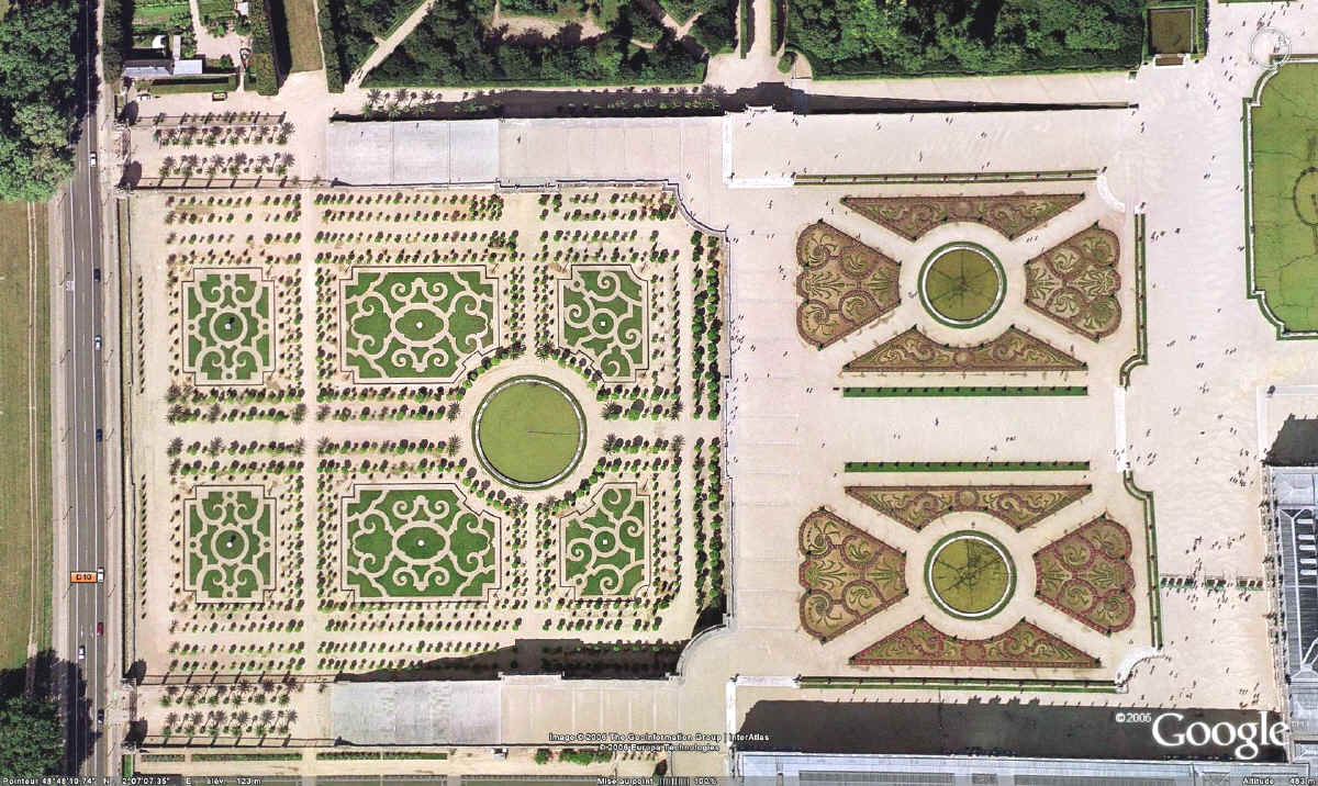 page précédente l'Orangerie bordée des escaliers des "Cents Marches" et le parterre du Midi vue de dessus (Copyright_Google)
