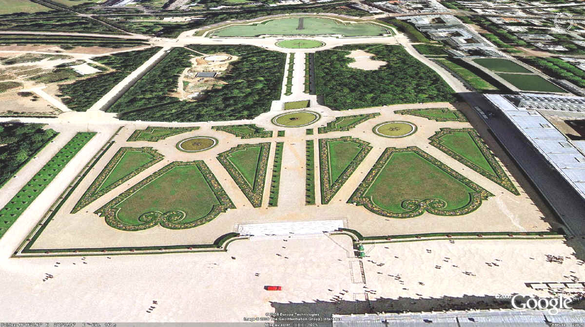 (cliquer sur le nom) le Parterre Nord (26), la Fontaine de la Pyramide (27), le Bosquet des Trois Fontaines (25)en cours de restauration et le Bosquet de l'Arc de Triomphe (30) , le Bain des Nymphes (28), l'Allée d'Eau (29), le Bassin du Dragon (31) et de Neptune (32) (copyright Google) |