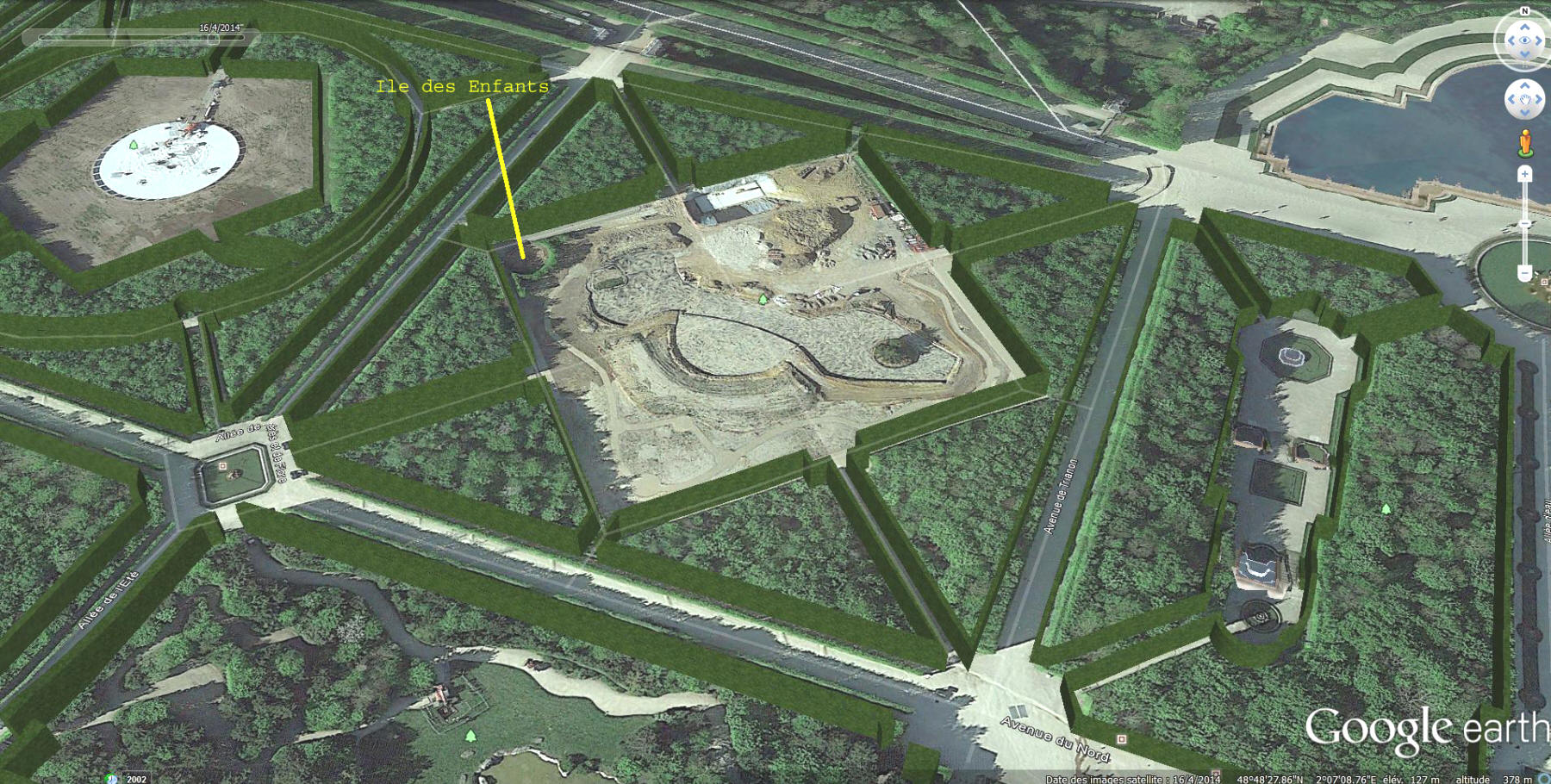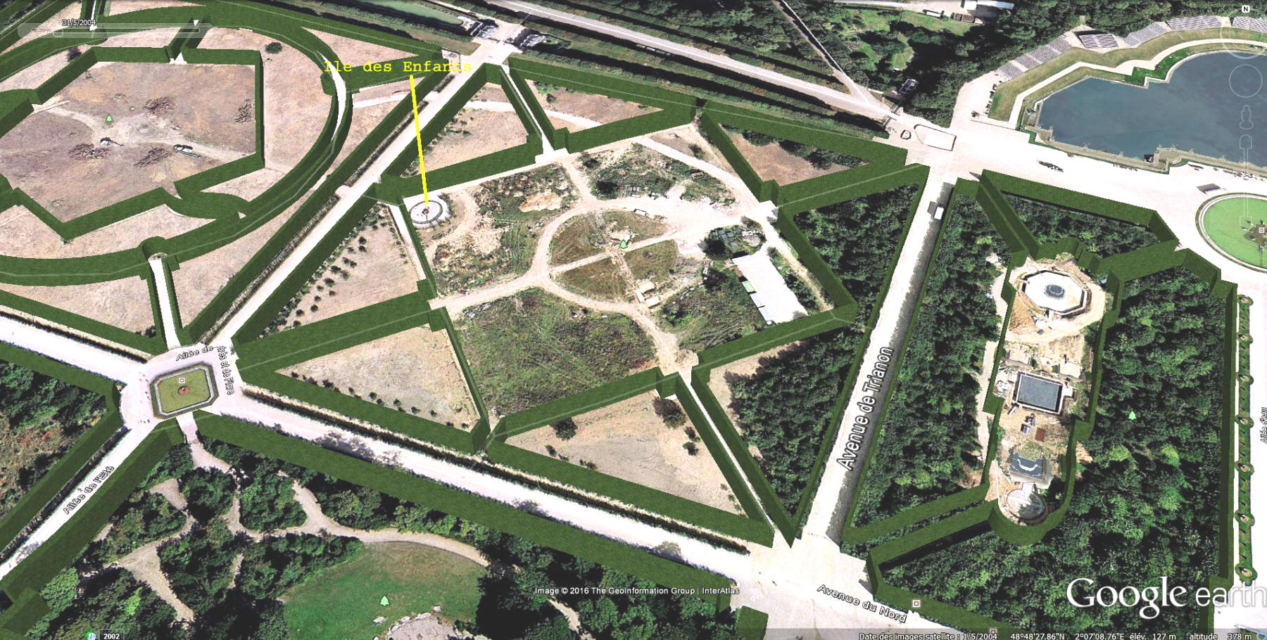 de gauche à droite: les Bosquets de l'Étoile(22), du Rond Vert ou du Théâtre d'Eau(24) et des Trois Fontaines(25) en cours de restauration - utilisez l'ascenseur (copyright Google - 29/08/2015)