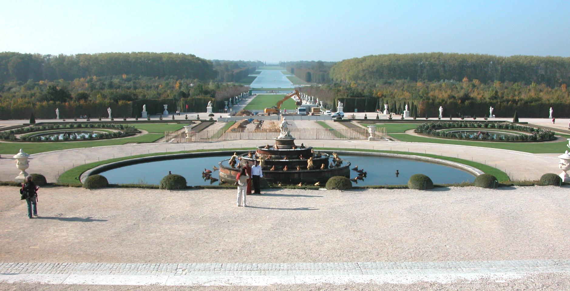 la "Grande Perspective" du Parc Central (16 octobre 2006) le bassin de Latone (6), le Tapis Vert (A), le Grand Canal (B)
