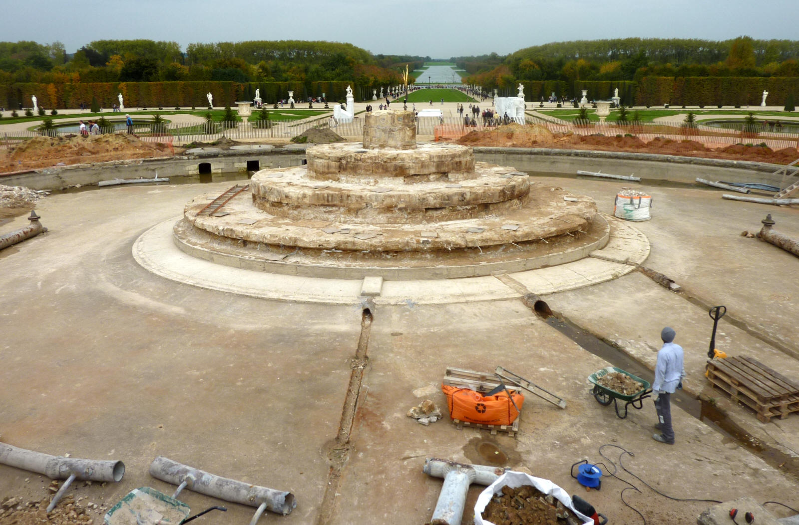 la "Grande Perspective" du Parc Central (pendant la restauration - 22 octobre 2013) le bassin de Latone (6), le Tapis Vert (A), le Grand Canal (B)