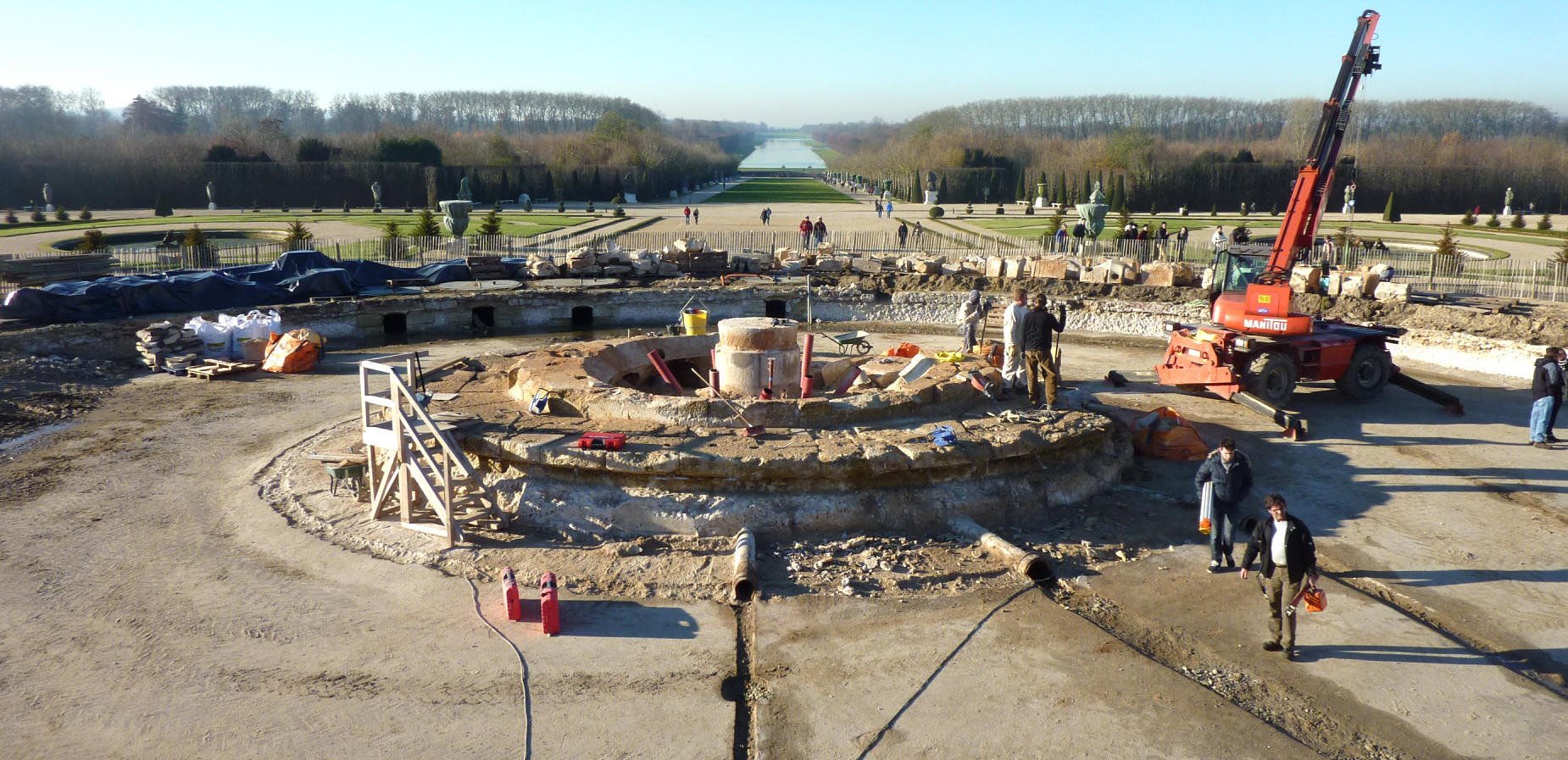 la "Grande Perspective" du Parc Central (pendant la restauration - 10 décembre 2013) le bassin de Latone (6), le Tapis Vert (A), le Grand Canal (B)