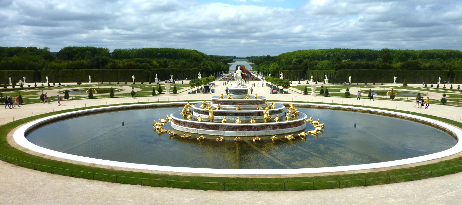 la "Grande Perspective" du Parc Central (après la restauration - 13 juillet 2015) le bassin de Latone (6), le Tapis Vert (A), le Grand Canal (B)