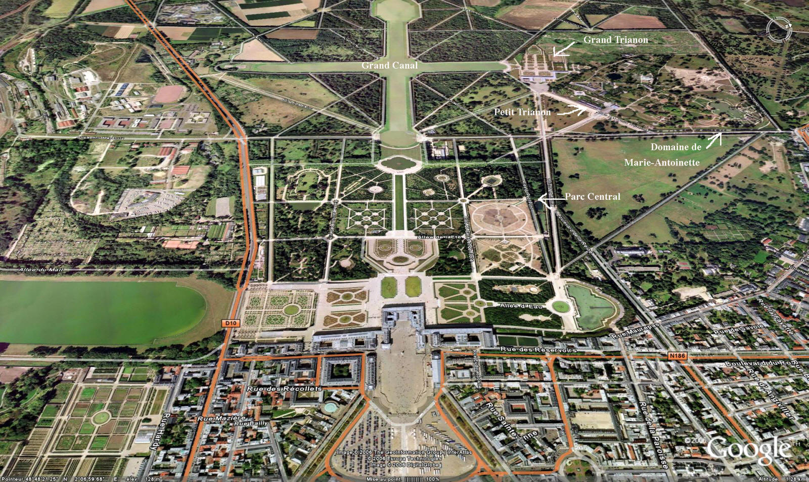 le Château, le Parc Central, le Grand Canal, le Grand et Petit Trianon et le Domaine de Marie-Antoinette (copyright Google)